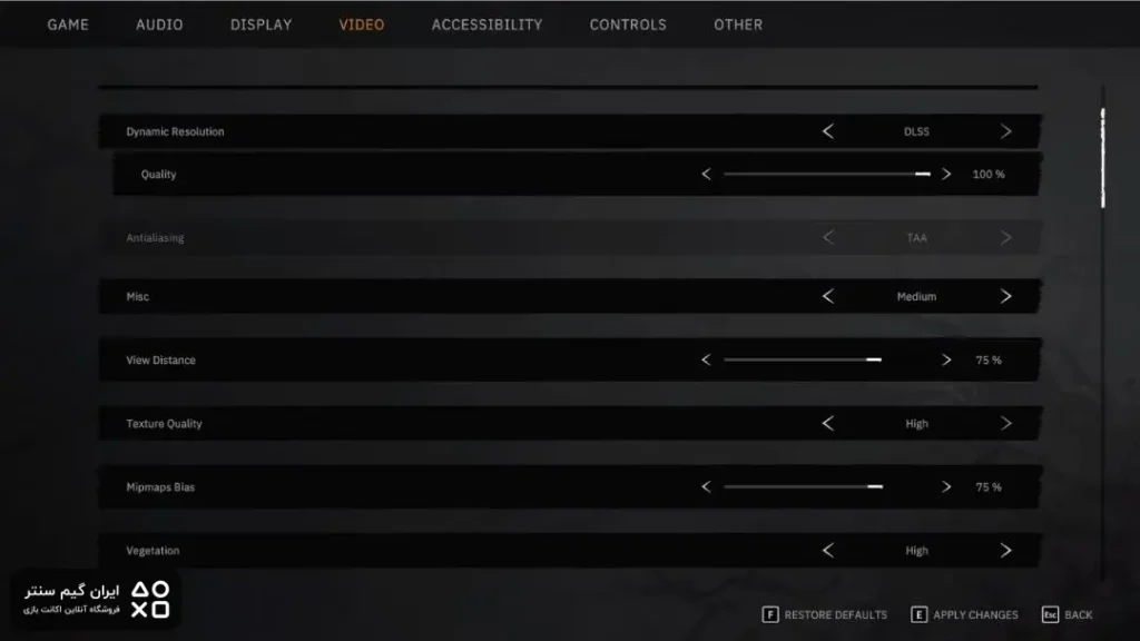 تنظیمات بازی به سه دسته اصلی تقسیم میشوند: دسترسپذیری، تنظیمات بصری و گرافیکی.